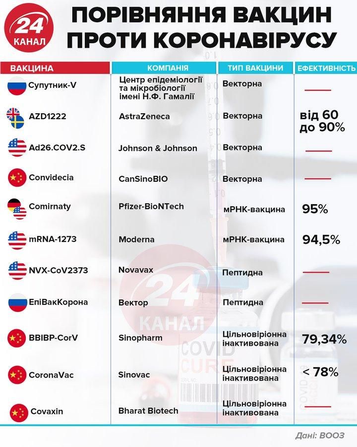 Вакцини проти коронавірусу / Джерело: МОЗ / Інфографіка 24 каналу