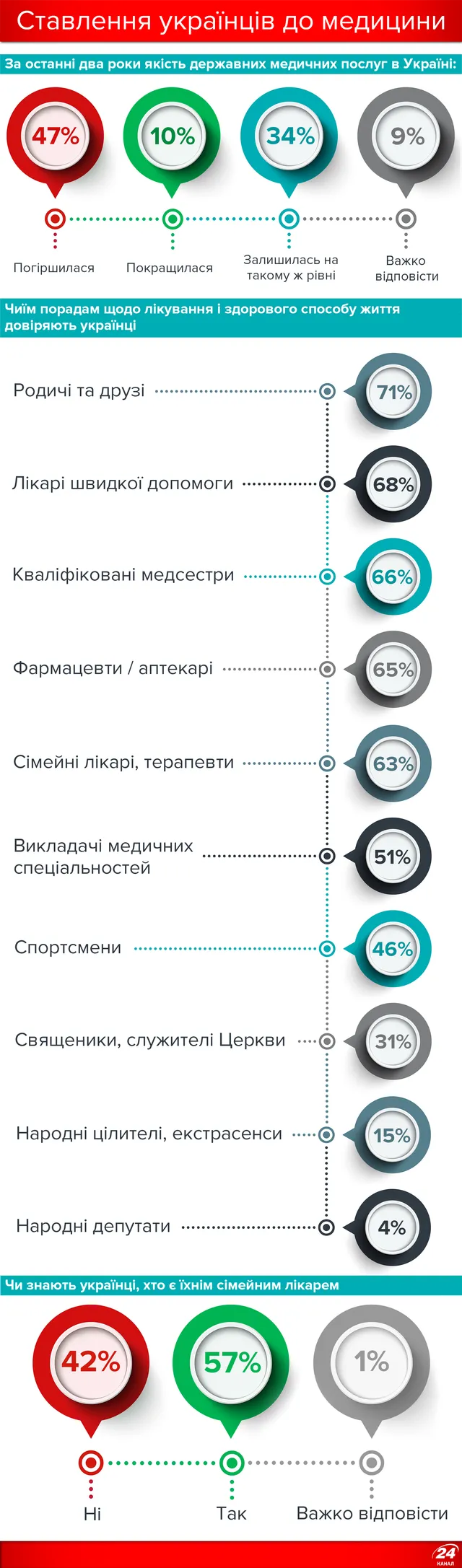 Понад 70% українців довіряє порадам щодо лікування, отриманим від родичів або друзів. На другому місці за "компетентністю" в українців – лікарі швидкої допомоги (68%). 66% опитаних довіряють кваліфікованим медсестрам, 65% – фармацевтам та аптекарям. А сімейні лікарі опинилися лише на п'ятому місці за рівнем довіри – 63%. Цікаво, що частина українців довіряє порадам щодо лікування від священиків (31%) і навіть екстрасенсів (15%).