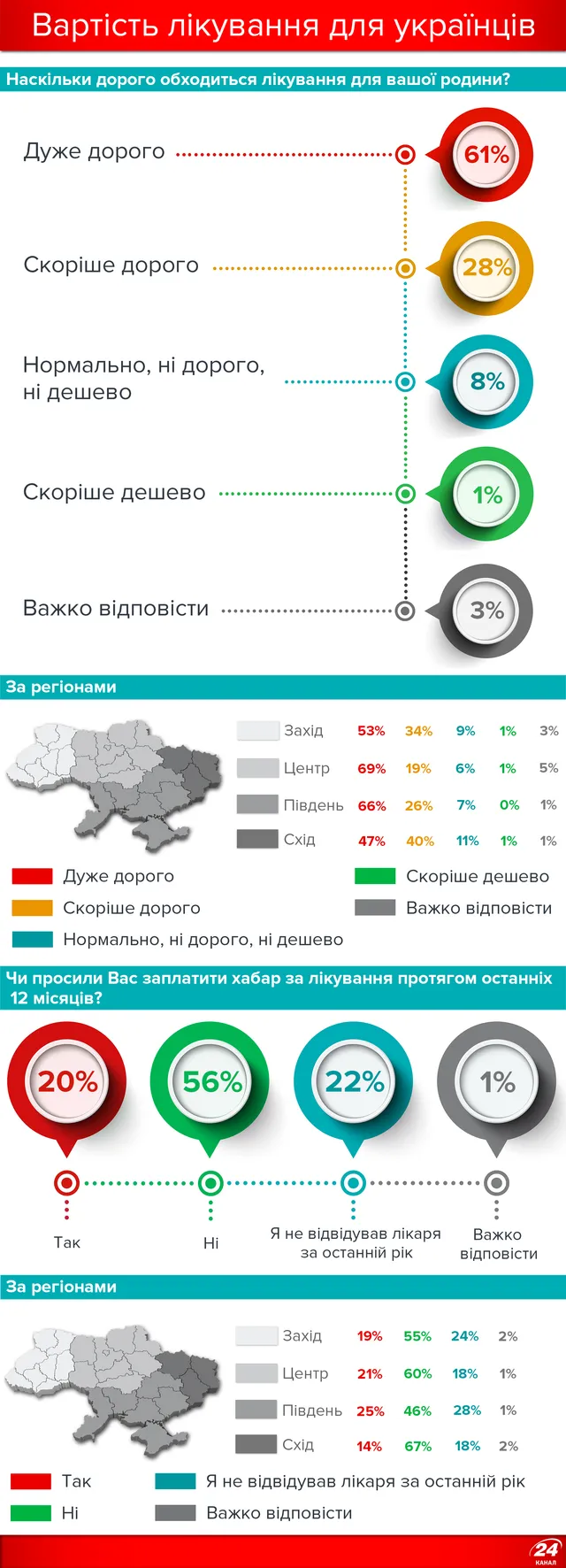 Вартість лікування в Україні опитані оцінили як дуже високу. 61% українців відповіли, що лікування обходиться для їхніх родин "дуже дорого", а для 28% – "дорого". Лише 8% українців лікуватися по кишені, а для 1% опитаних це навіть дешево. Цікаво, що найбільше людей, для яких лікування обходиться дорого або дуже дорого, проживає на півдні країни – 92%. І саме там у пацієнтів найчастіше вимагали хабарі – у чверті випадків.
