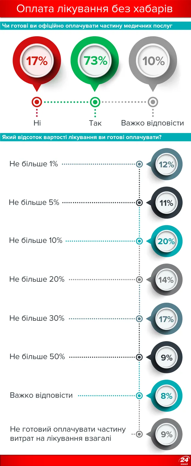 Що ж до платної медицини – то в більшості українці до неї готові. 73% опитаних погодилися б офіційно оплачувати частину медичних послуг у державних закладах. 17% проти такого нововведення. Однак, якщо говорити про суми, які готові віддавати українці на лікування, тут думки розходяться. 20% опитаних готові оплачувати не більше 10 відсотків вартості лікування, 17% – не більше 30 відсотків, 14% – не більше 20 відсотків.