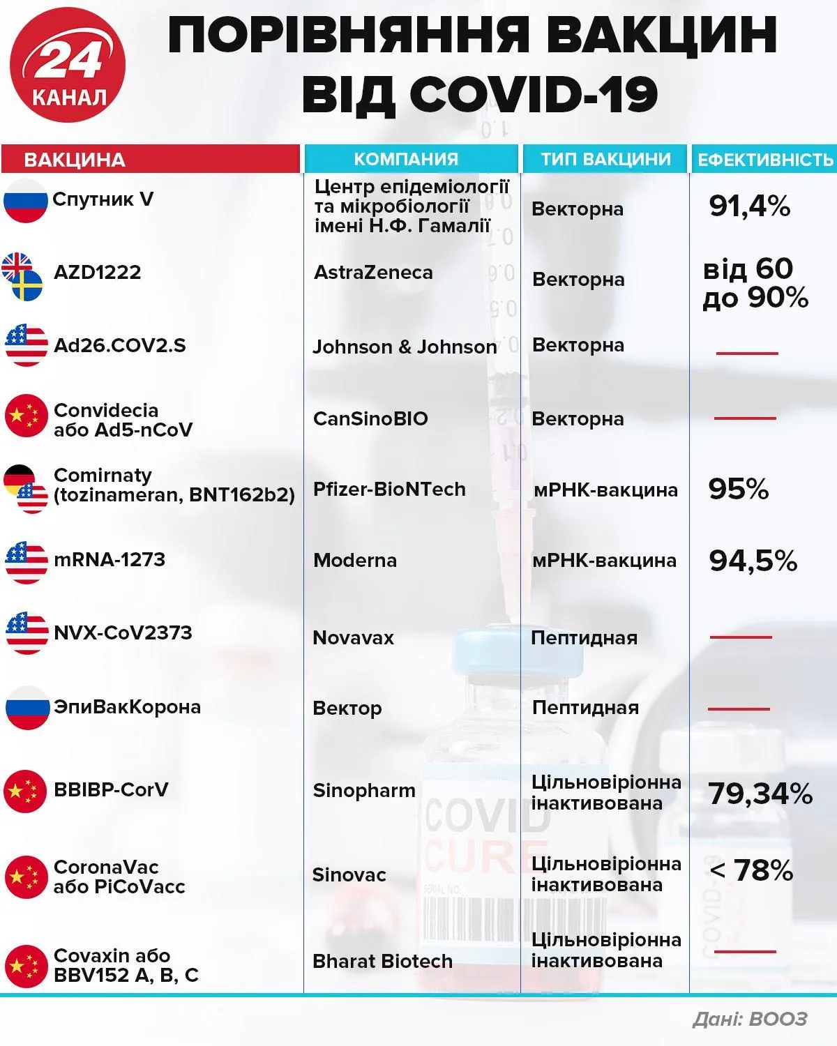 Порівняння вакцин проти COVID-19 / Джерело: ВООЗ / Інфографіка 24 каналу