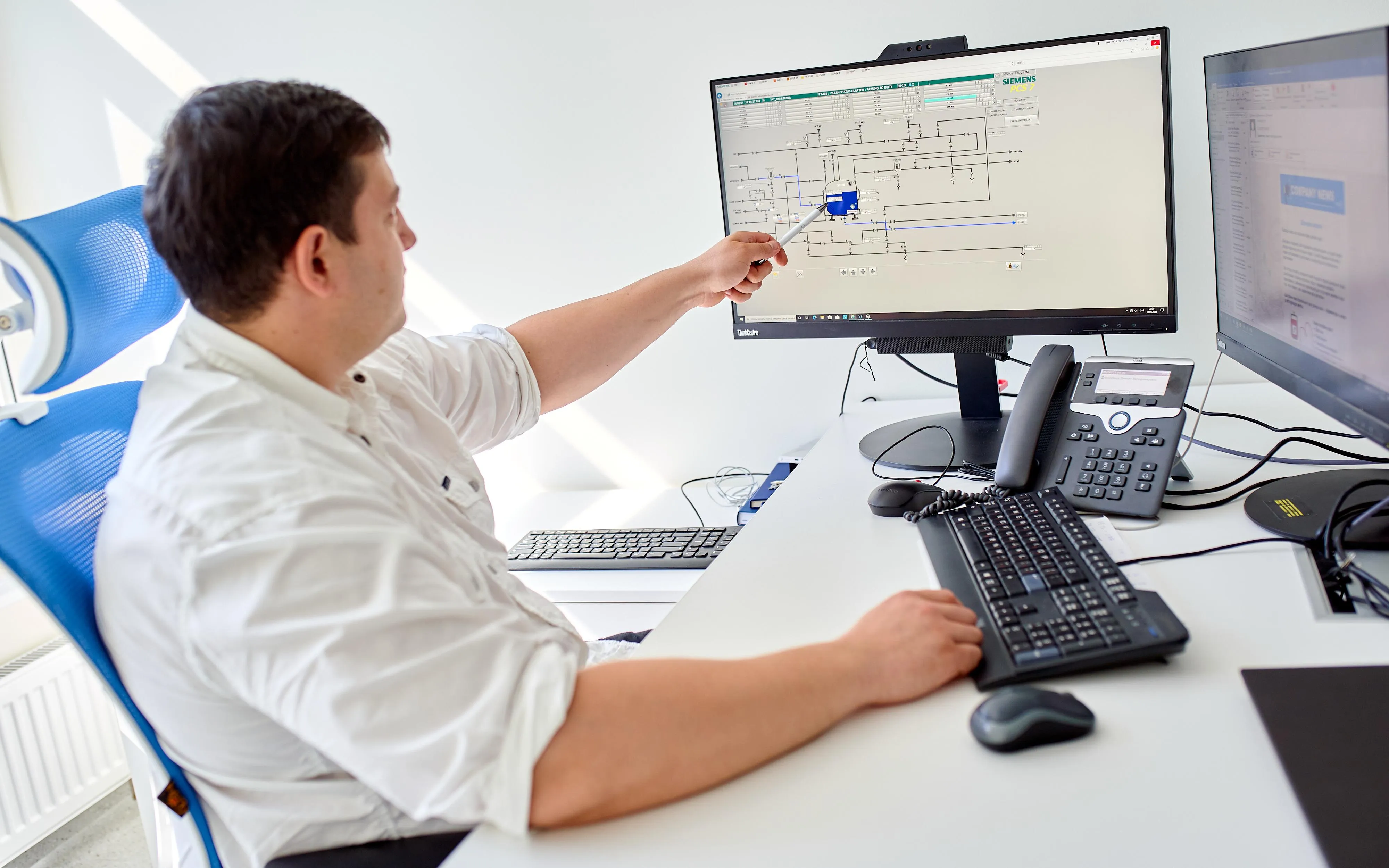 На схемі комп’ютера видно, який технологічний процес зараз відбувається: наприклад, подача води у реактор (прим. апарат для виробництва лікарських засобів), подача сировини, нагрівання, перемішування чи, наприклад, подача приготовлених ліків на машину наповнення тощо.