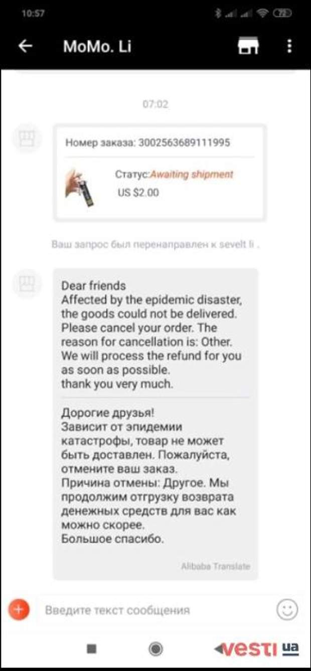 "Дорогие друзья! Из-за эпидемии товар не может быть доставлен. Пожалуйста, отмените ваш заказ. Мы вернем средства как можно быстрее", – говорится в сообщении одного из продавцов.
