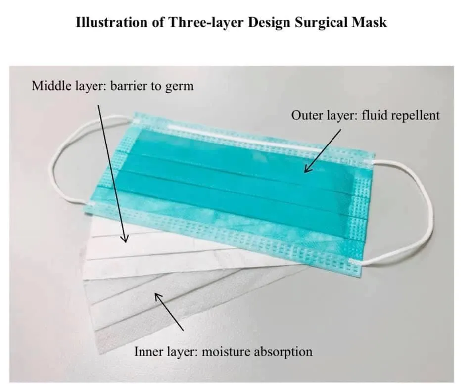 Внешний (цветной) слой – водоотталкивающий, чтобы к маски извне не прилипали капли вирусов, среднюю – фильтровальную, чтобы задержать микробы, и внутренний – водовпитывающий, чтобы впитать влагу, которая выделяется с воздухом, которую выдыхает человек.
