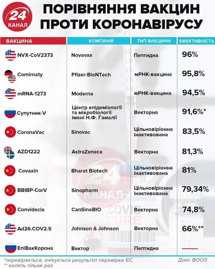 Сравнение вакцин против COVID-19 / Источник: ВОЗ / Инфографика 24 канала
