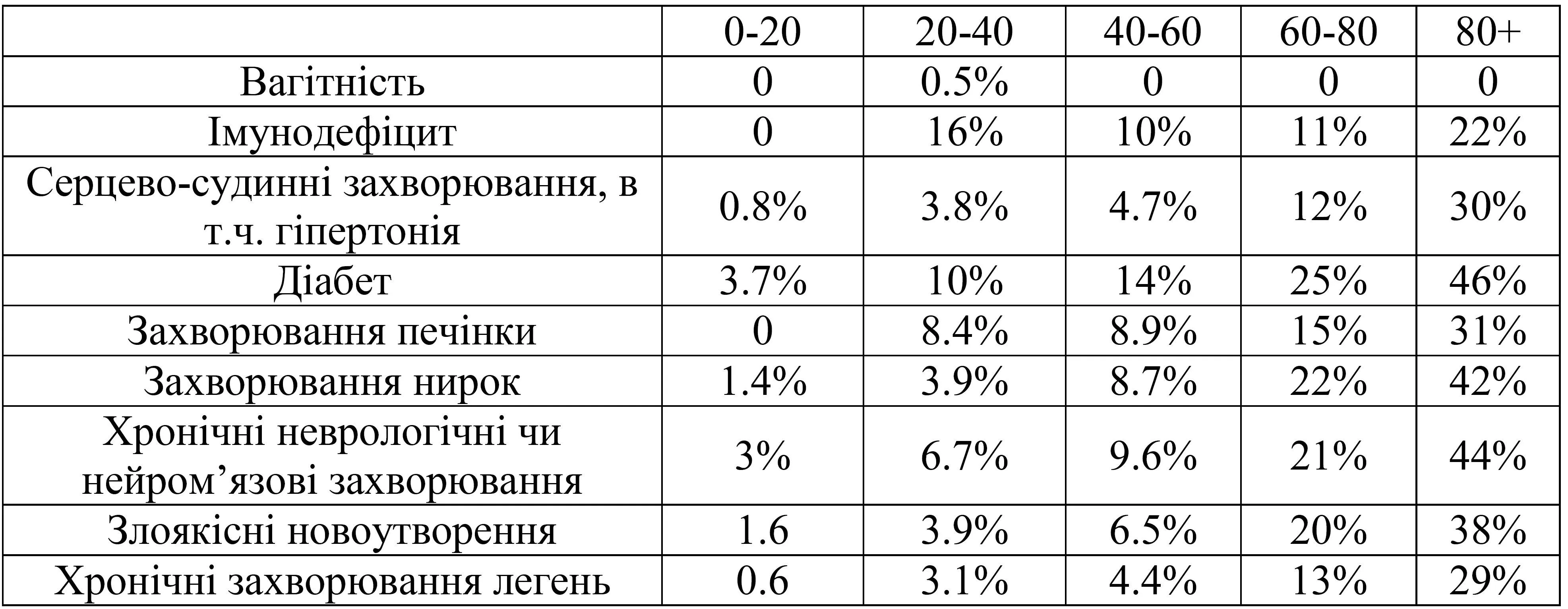 Летальность при COVID-19 по возрастным группам и сопутствующим болезням / Таблица НАН