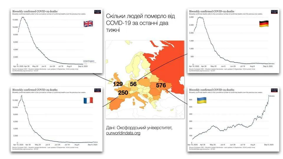 На інфографіці зображена реальна ситуація зі смертністю від коронавірусу в Україні у порівнянні з Францією, Британією та Німеччиною. За минулі два тижні у Німеччині померли 56 пацієнтів, у Британії – 129, а у Франції – 250. А ось в Україні за минулі два тижні померли 576 хворих. Це більше, ніж у всіх цих трьох країнах разом взятих.
